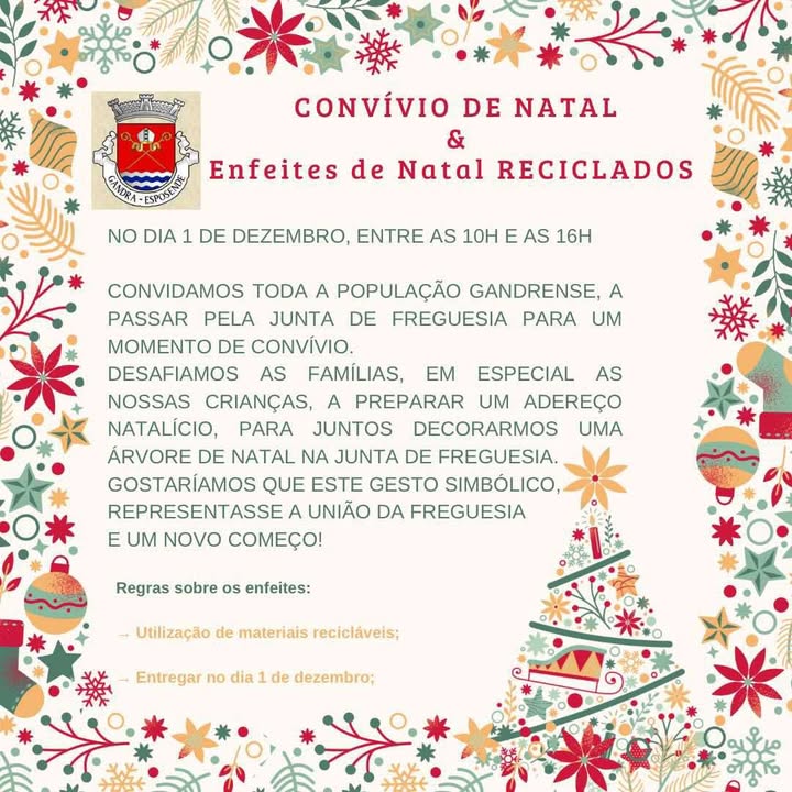 DESAFIAMOS AS FAMÍLIAS, EM ESPECIAL AS NOSSAS CRIANÇAS, A PREPARAR UM ADEREÇO NATALÍCIO, PARA JUNTOS DECORARMOS UMA ÁRVORE DE NATAL NA JUNTA DE FREGUESIA.